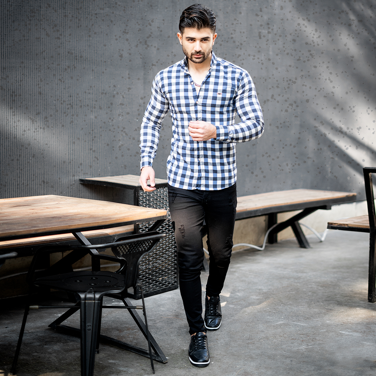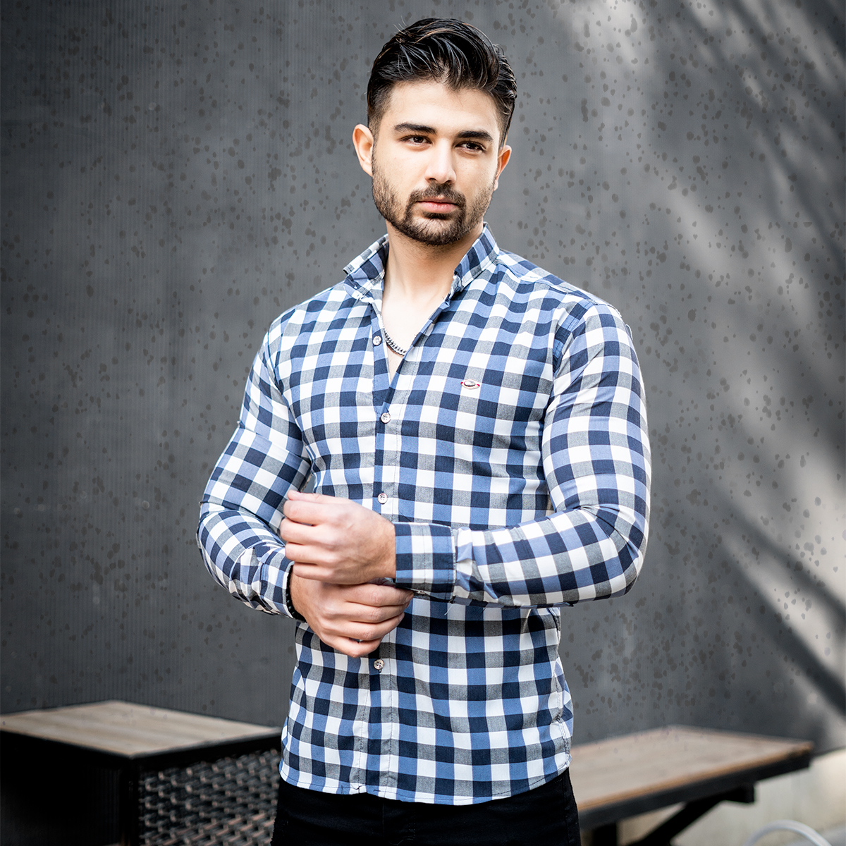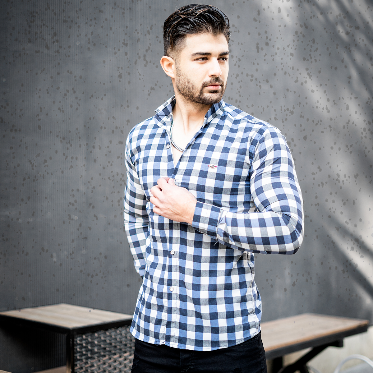 پیراهن مردانه چهارخونه آبی سفید مدل mika