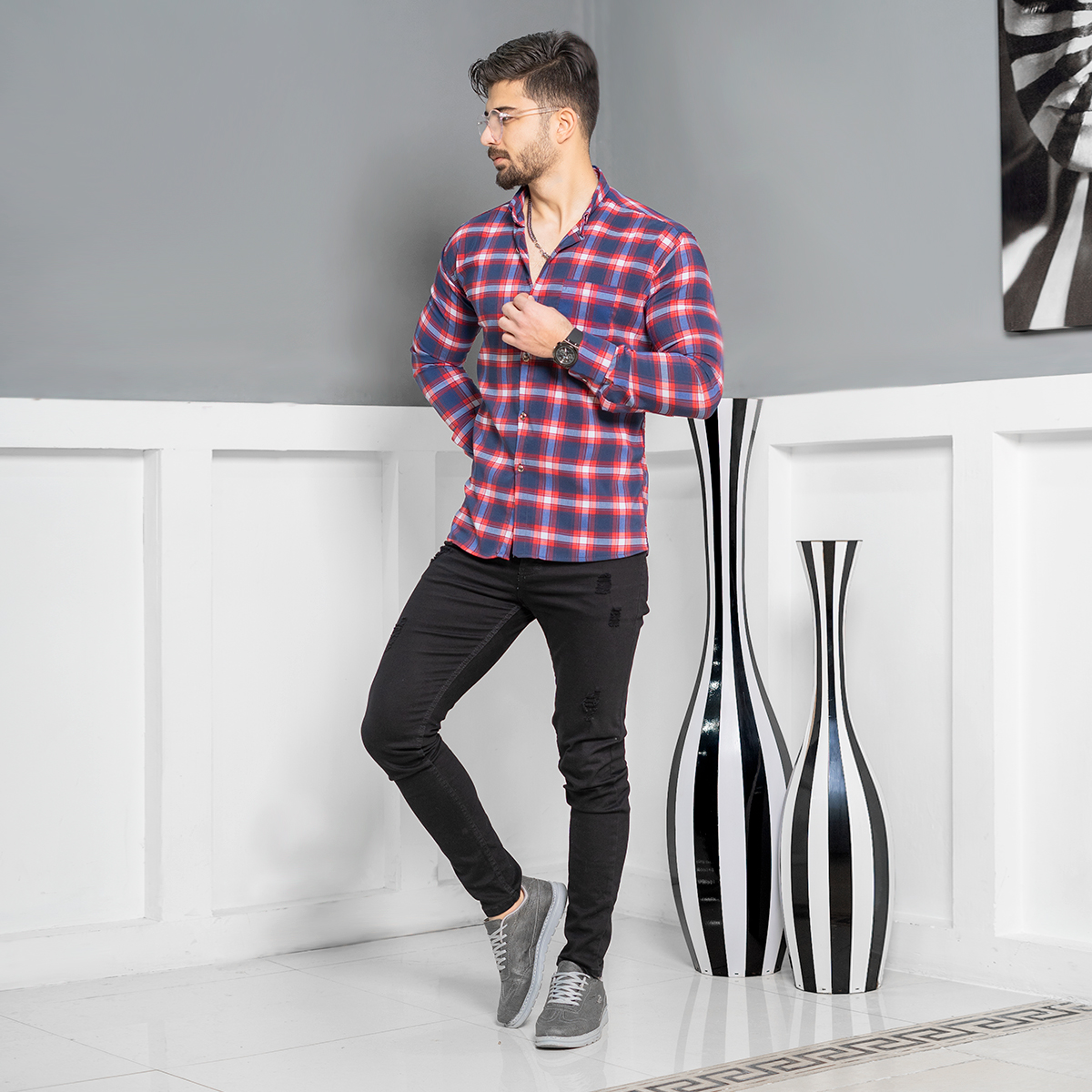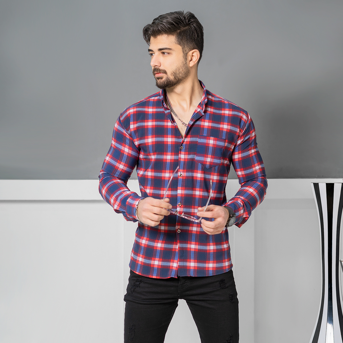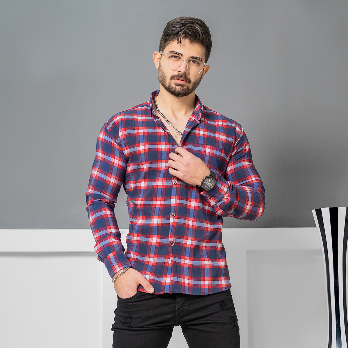 پیراهن مردانه چهارخونه سرمه ای قرمز مدل Tivon