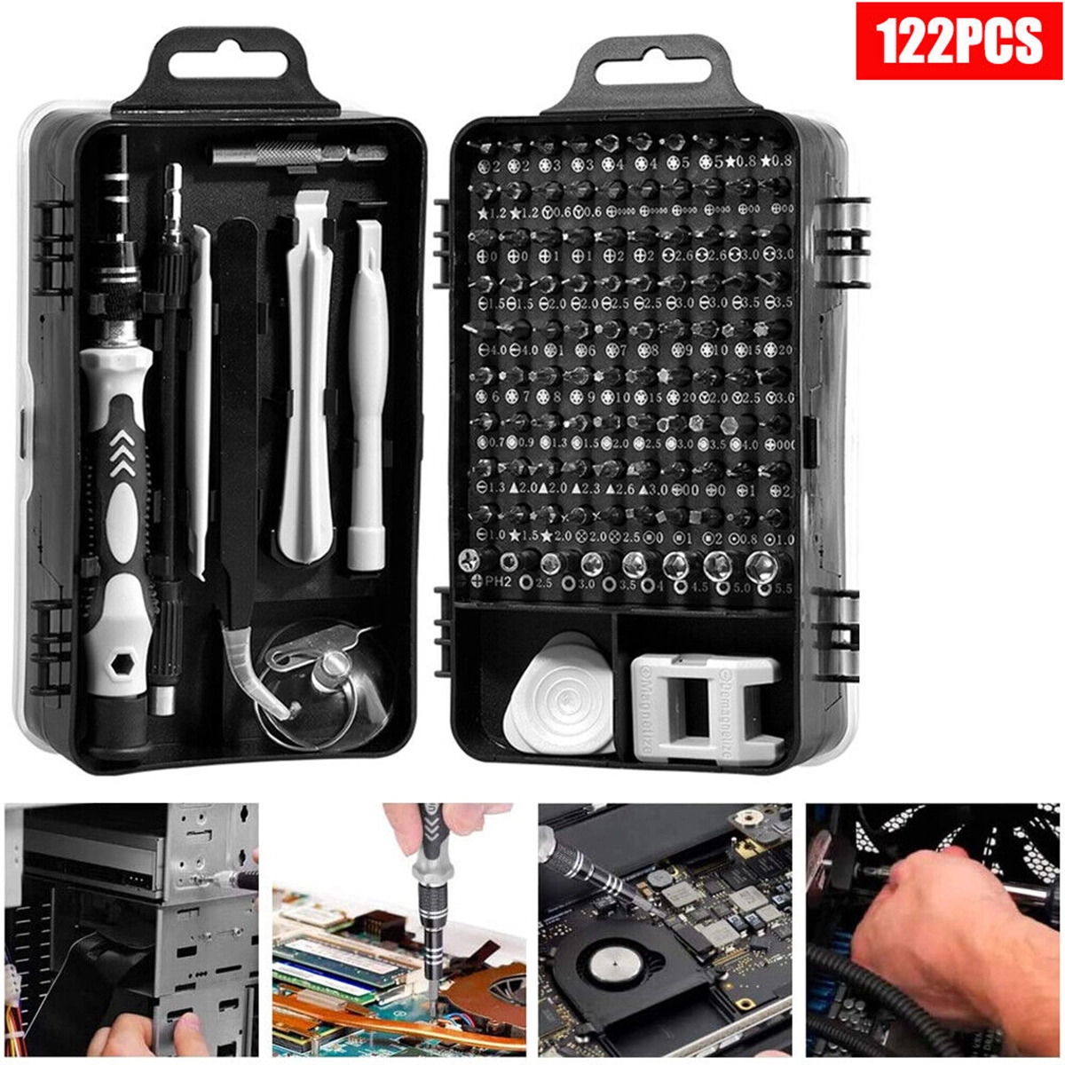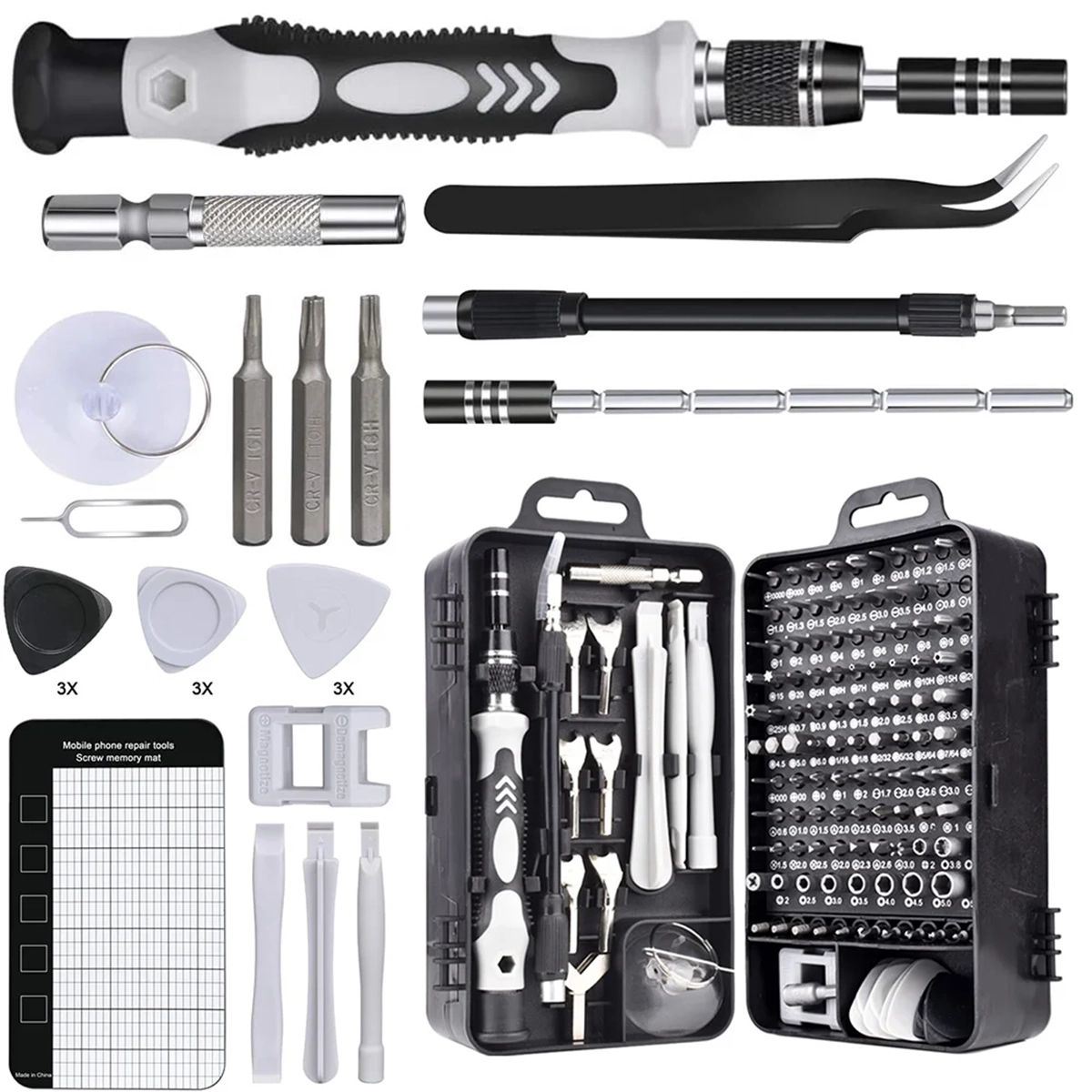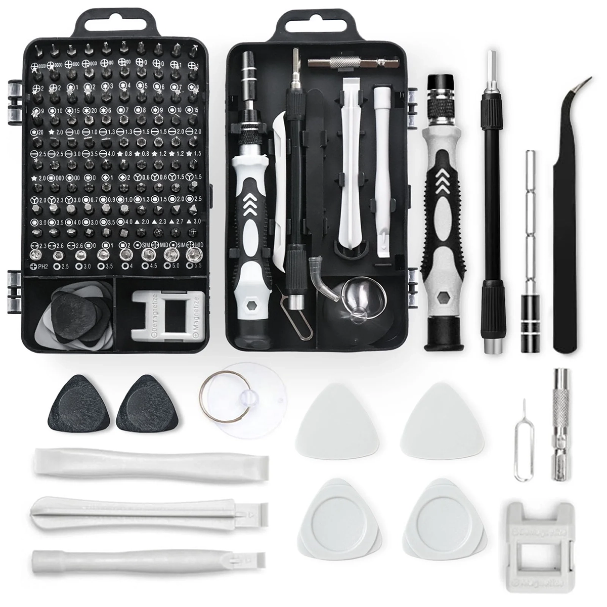 ست کامل ابزار: همراه با آهنربا/مغناطیس‌زدا، پد مغناطیسی، ابزار بازکن پلاستیکی، اسپاجر، موچین ضدزنگ، نگهدارنده بیت و شفت انعطاف‌پذیر
